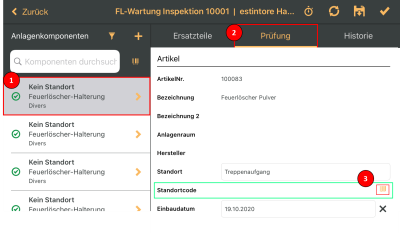 Wählen Sie in der Liste der Anlagenkomponenten eine Komponente aus und tippen dann auf das Register Prüfung.