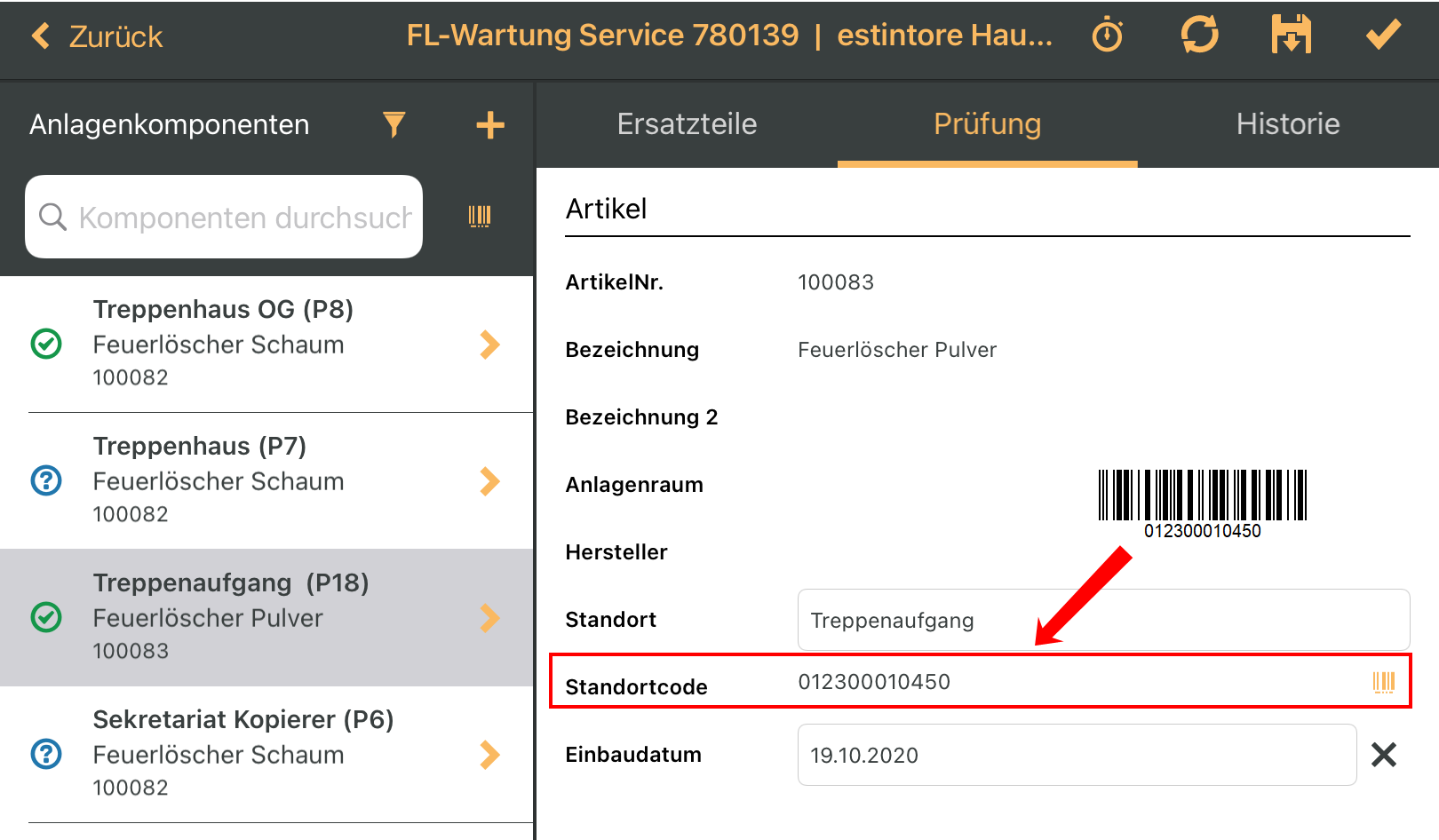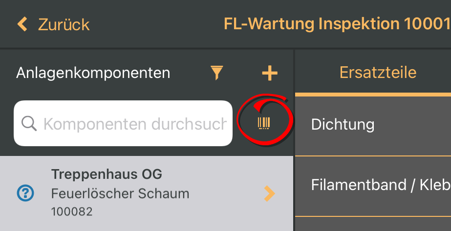 Um anhand eines Barcodes eine Komponente in der Liste der Anlagenkomponenten zu finden, tippen Sie auf die