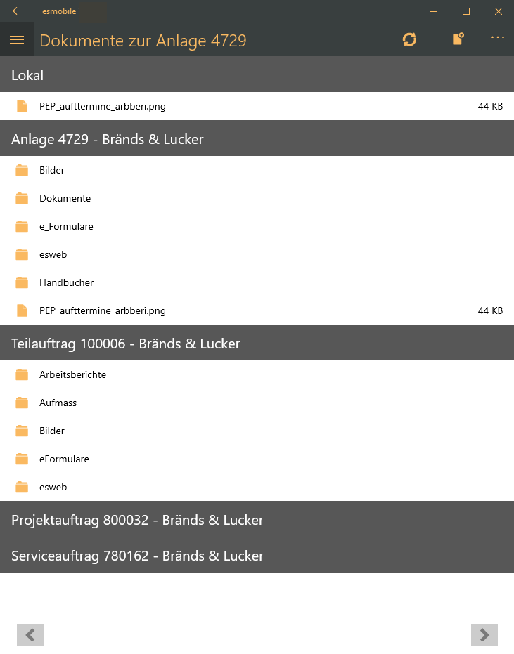 Aktualisieren Schaltfläche können Sie die Liste der Datensätze vom Server abrufen. Dabei werden neue / geänderte Datensätze aus dem esoffice / esweb vom Server angezeigt.