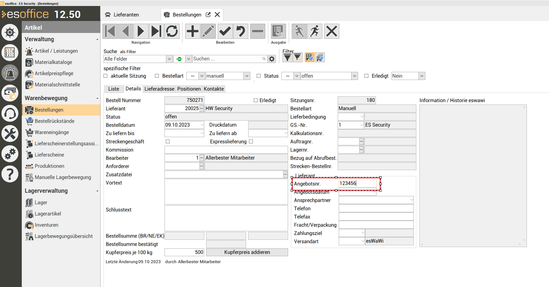 Sie haben die Möglichkeit, innerhalb der Bestellbearbeitung im Bestellkopf auf dem Register Artikel | Bestellungen | Details im Feld Angebotsnr., eine Angebotsnummer (Q-…) von Honeywell einzutragen.