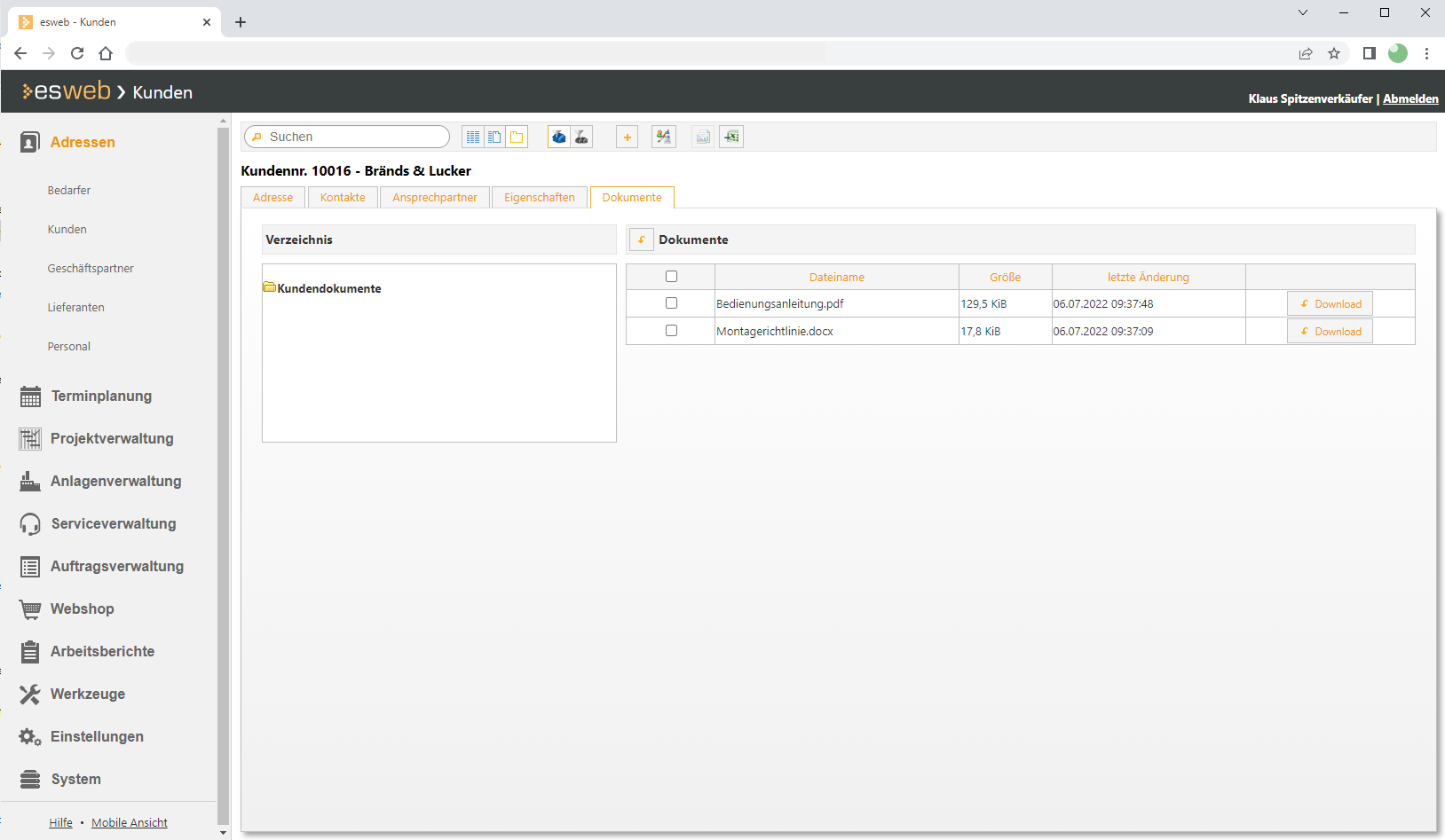 In der Detailansicht eines Kunden können Sie sich auf dem Register Adressen | Kunden | Dokumente einen öffentlichen Ordner mit Kundendaten anzeigen lassen.