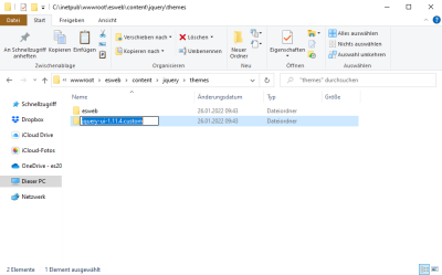 Entpacken Sie die heruntergeladene ZIP-Datei in den Design-Ordner Ihrer esweb-Installation unter Content -> jquery -> themes. Der Speicherort ist individuell, der hier gezeigte Screenshot ist lediglich ein Beispiel.