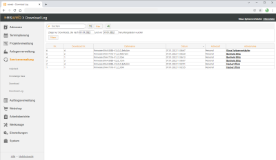 Über den Menüpunkt Serviceverwaltung | Download Log erhalten Sie eine Übersicht über die Downloads der Kunden und der Mitarbeiter.