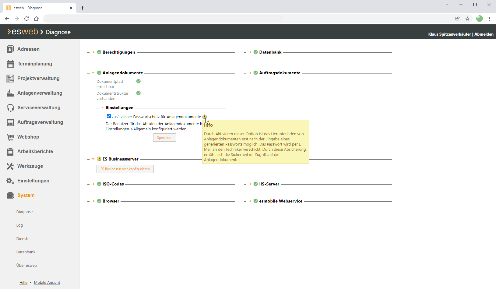 Unter dem Menüpunkt System | Diagnose können Sie überprüfen, ob der IIS Webserver und die esweb-Installation korrekt eingerichtet sind.